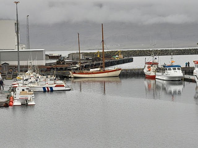 Jon drove across Iceland to Grindavik, a 6 hour drive, and left the car there. We set up Teddy for the trip - refuelling; tighten the mizzen stays so that we had two sails, the mizzen and the staysail; final clearance of the bowsprit wreckage. We motorsailed nonstop 48 hours and got in the day before yesterday, no hassle.